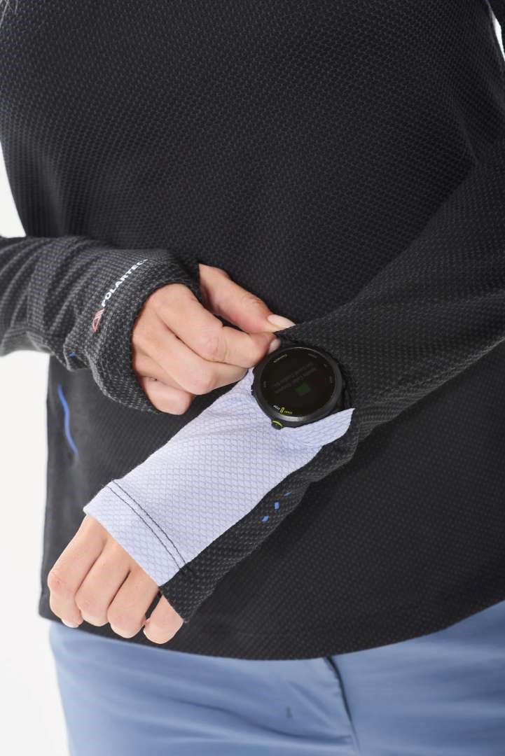 • Mangas largas con pasa pulgar y abertura para reloj/pulsera.